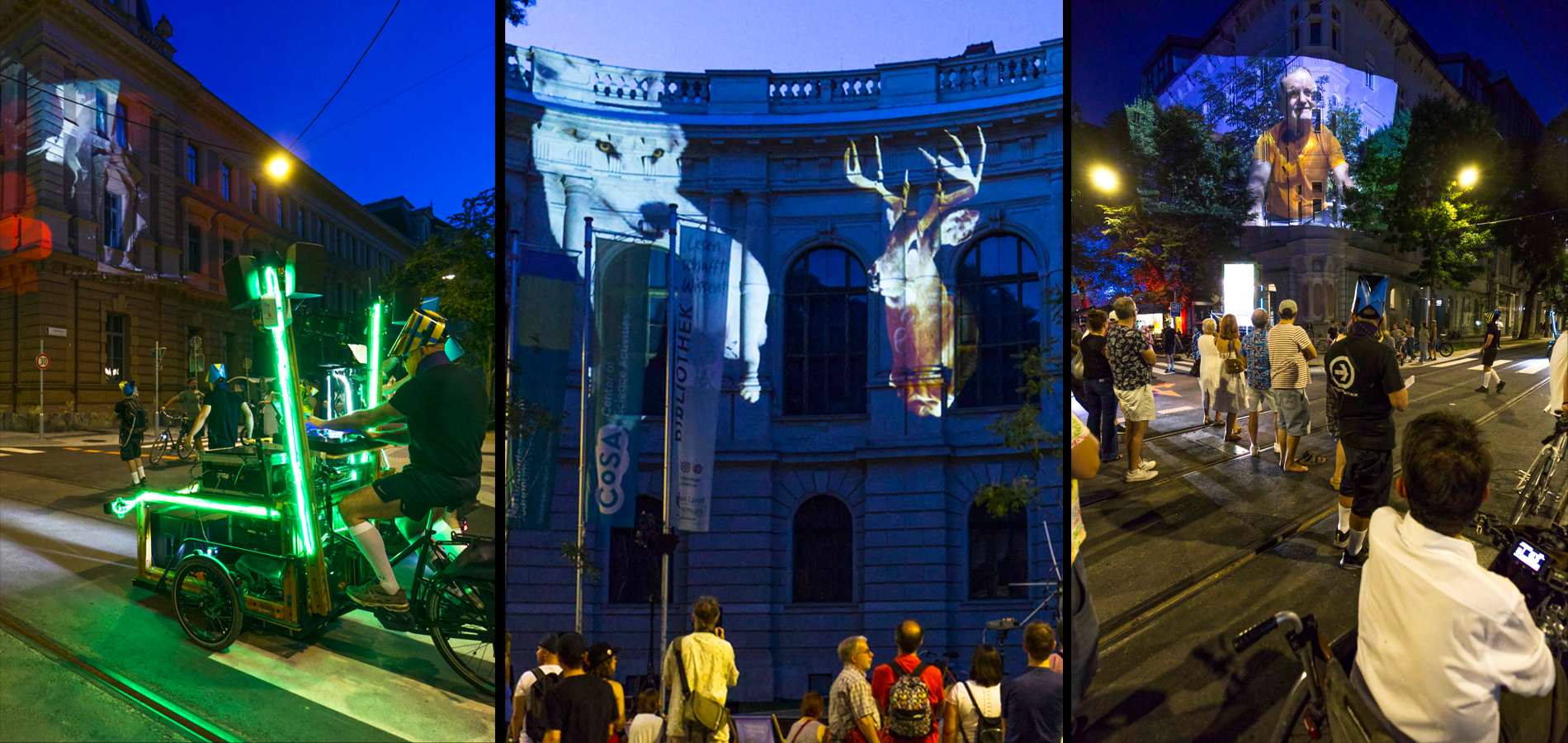 En proximité avec le public, une flotte de vélos cargo customisés déploie un univers visuel monumental sur les façades